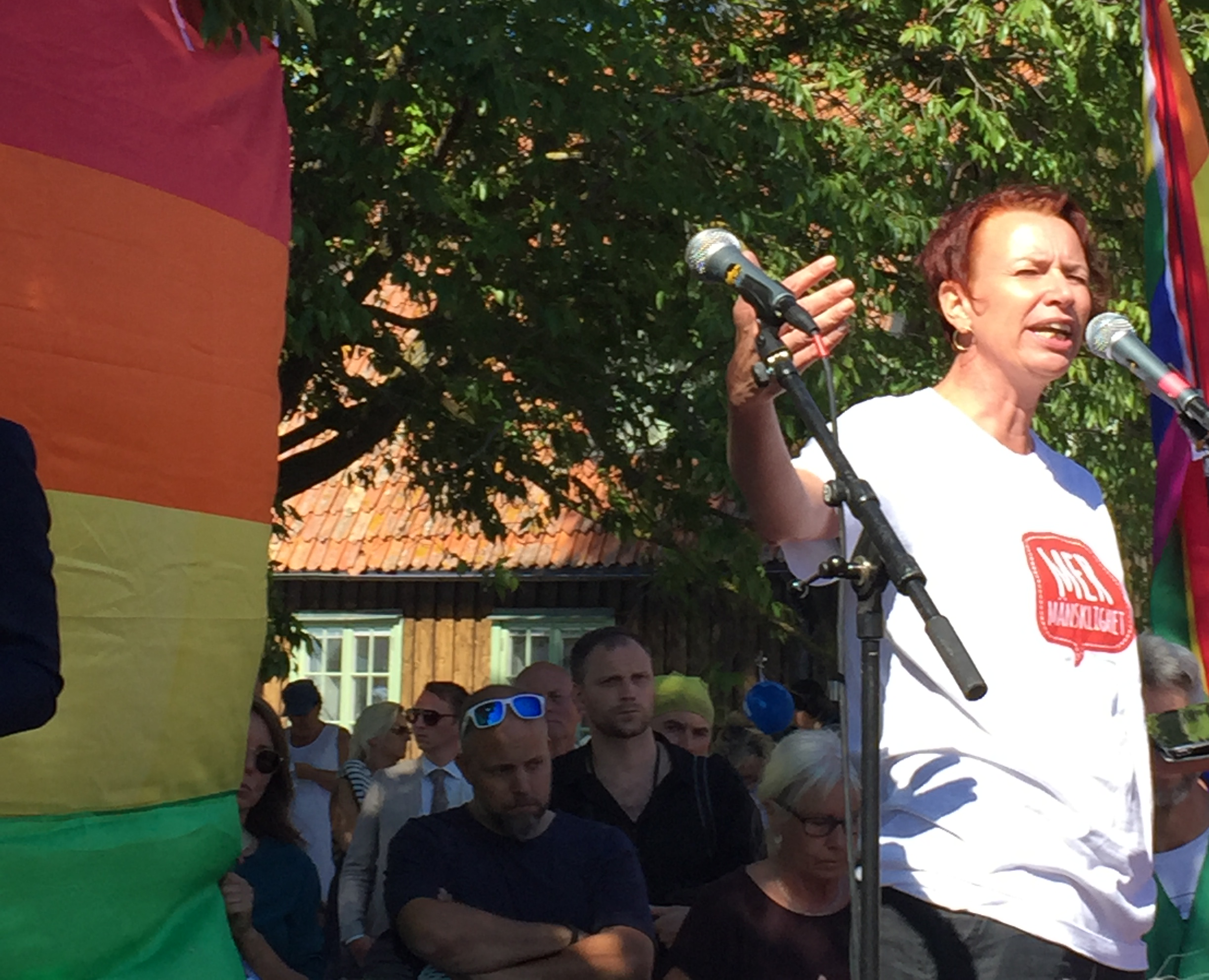 Det blev rekord på RFSL:s Mångfaldsparad i Almedalen idag. Nära 4000 hade mött upp för att manifestera tillsammans för kärleken och allas lika värde – och mot NMR, vars närvaro i Almedalen skrämt många men också bidragit till en tydligt skärpt motståndsvilja. En av talarna var Vänsterpartiets Christina Höj Larsen som betonade att nazisternas tid aldrig kommer att kunna komma tillbaka, om vi som är så många fler håller ihop.