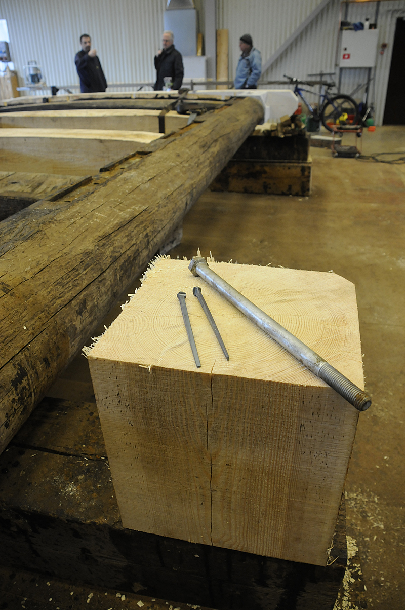 En slussport ligger just upplagd i lokalen, en jätte som inger respekt. Varje port är dessutom unik, ingen är den andra lik, alla har byggts på plats i slussarna. Här arbetar man med de gamla metoderna, allt ska göras som förr. Det är få som kan det gamla hantverket. Träet behandlas med tjära, mellan plankorna tätas med lindrev som flätas, sedan täcker man springorna med beck. Järnet mönjas och målas med linolja.