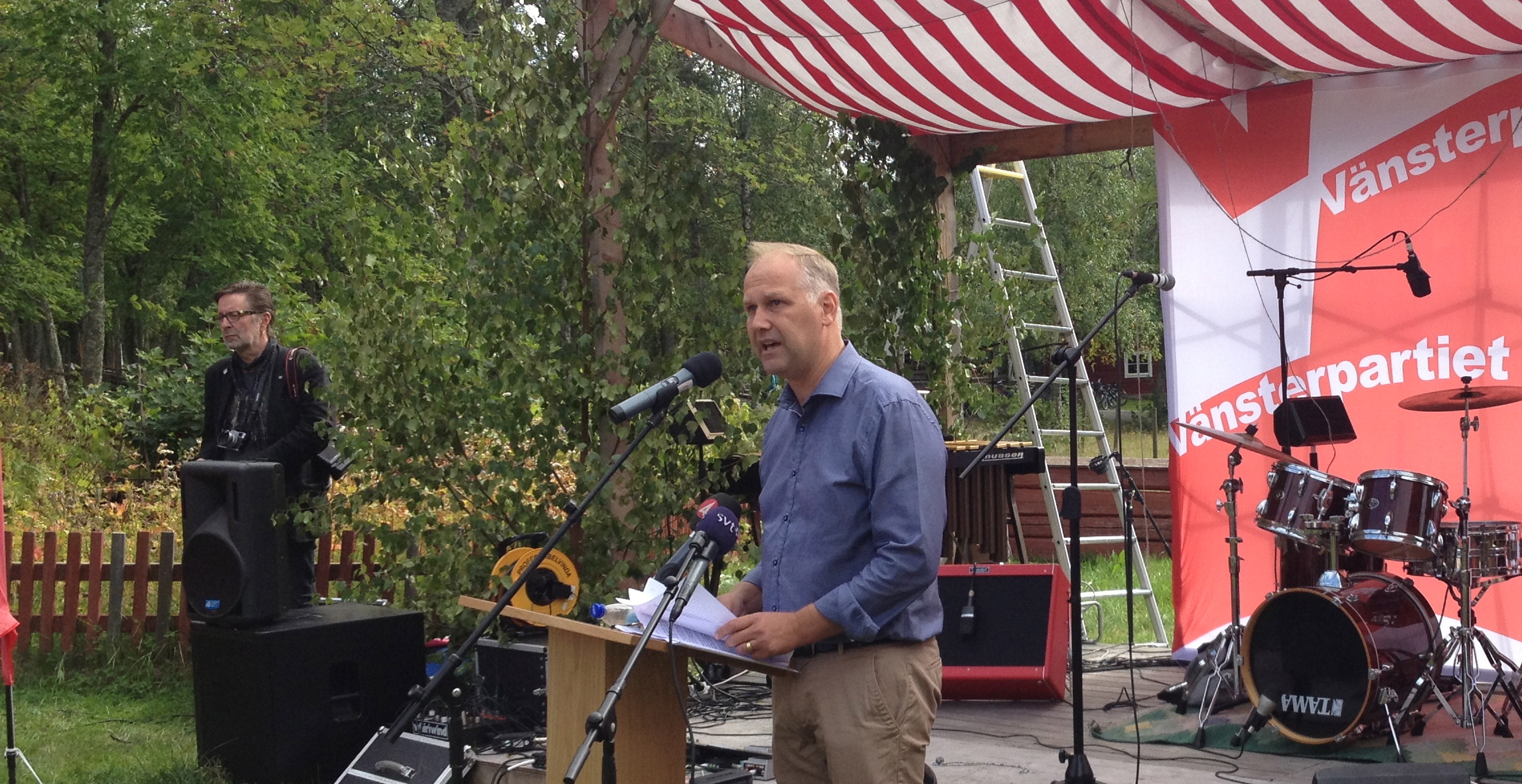 Av lördagens regn märktes inget när en månghövdad publik, varav många barnfamiljer, samlades på tunet utanför Gammlia, Umeå länsmuseums friluftsmuseum, på söndagen. Många Umebor hade tagit en söndagspromenad hit för att lyssna till Jonas Sjöstedt och Ulla Andersson. Även Tamara Spiric, kommunalråd i Umeå och Mia Grip, gruppledare i landstinget talade.