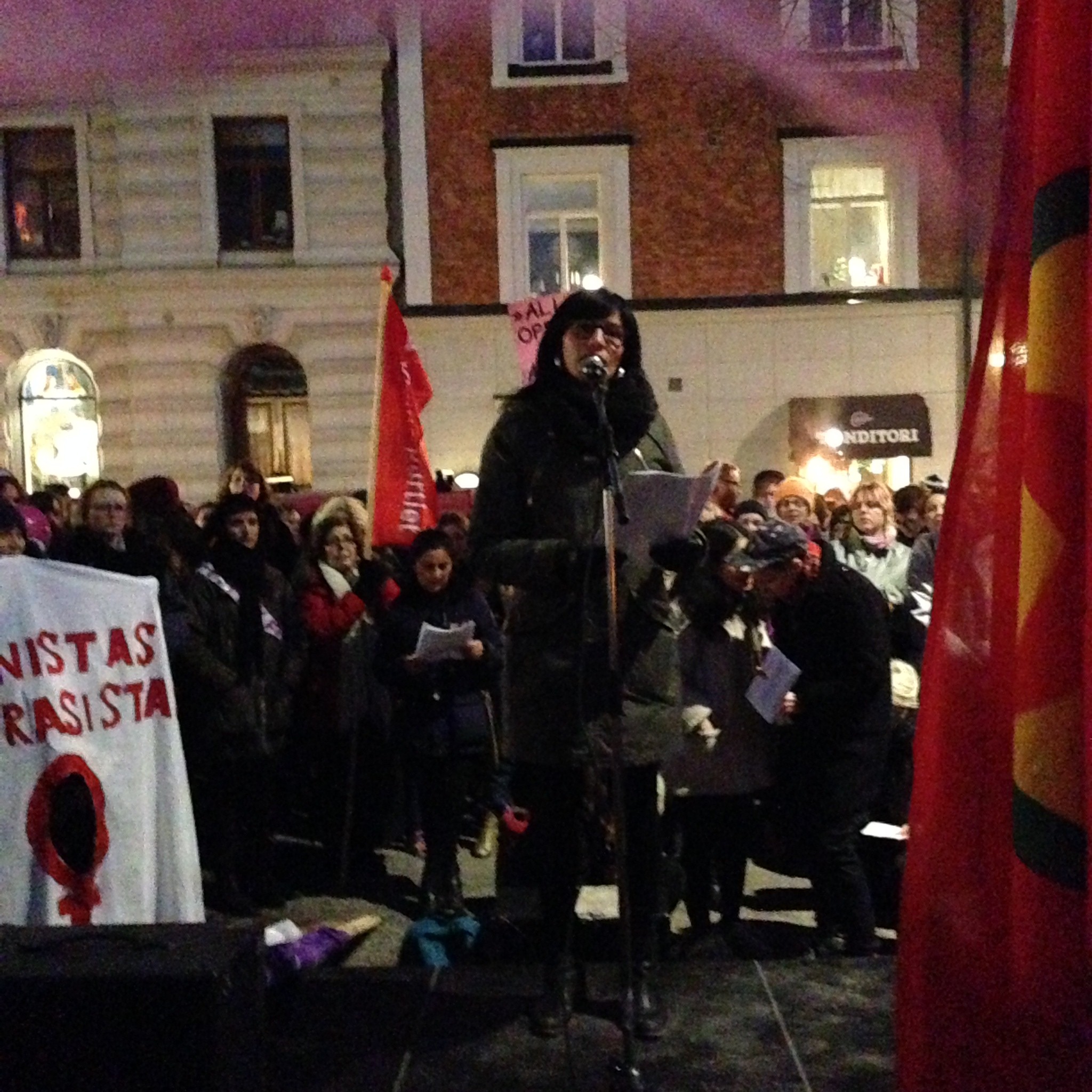 Vänsterpartiets feministiska talesperson Rossana Dinamarca höll tal på 8 mars-kommitténs stora manifestation på Martiatorget i Stockholm.