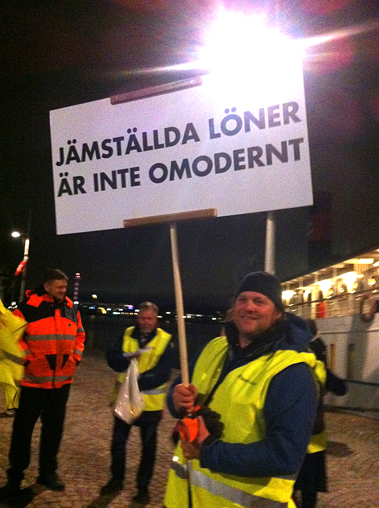 På bilderna syns strejkvakter bevaka en båt som aviserat att den skulle avgå, bemannad med strejkbrytare, men som aldrig avgick. Flaggan är Röda Lanternans, en organisation inom SEKO Sjöfolk som står nära Vänsterpartiet.