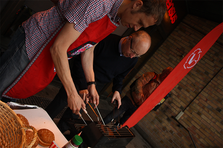 Vänsterpartiet gör precis tvärtom. Jens Holm, miljöpolitisk talesperson, och Mikael Gustafsson, EU-parlamentariker, delade – under epitetet ”Vänsterkockarna” – ut vegetariska burgare på Medborgarplatsen. Och kön ringlade lång uppför Medborgarhusets trappa där de hade monterat upp grillen.