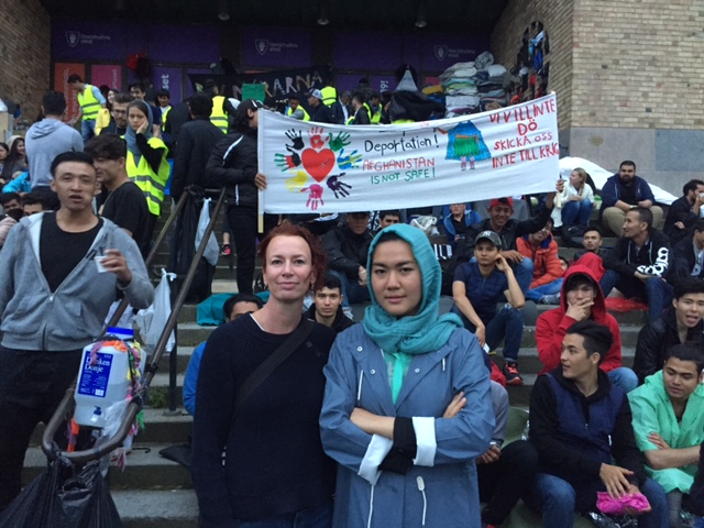 – De kräver att bli lyssnade på – att vuxenvärlden ska erkänna deras situation och använda sin makt för att göra något för att stoppa utvisningarna till Afghanistan, ett krav som Vänsterpartiet självklart stödjer, säger Christina Höj Larsen, Vänsterpartiets migrationspolitiska talesperson, som besökte ungdomarna redan när strejken inleddes och nu i helgen träffade dem igen. På bilden står hon tillsammans med talespersonen Fatameh Khavari, från Ung i Sverige.