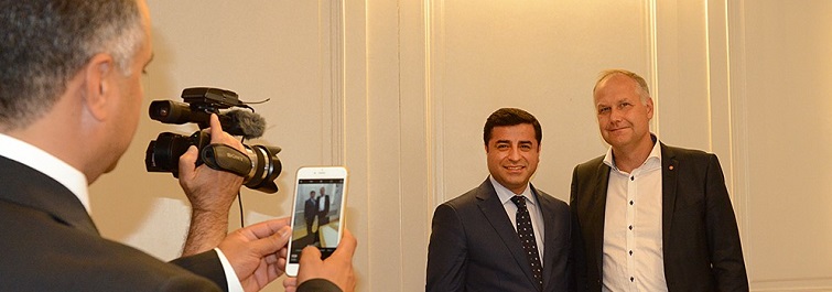 På bilden: Jonas Sjöstedt är fadder åt HDPs partiledare Selahattin Demirtaş, som idag är på besök i Sverige.